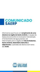 A equipe da Saerp já se encontra no local para manutenção. O fornecimento de água