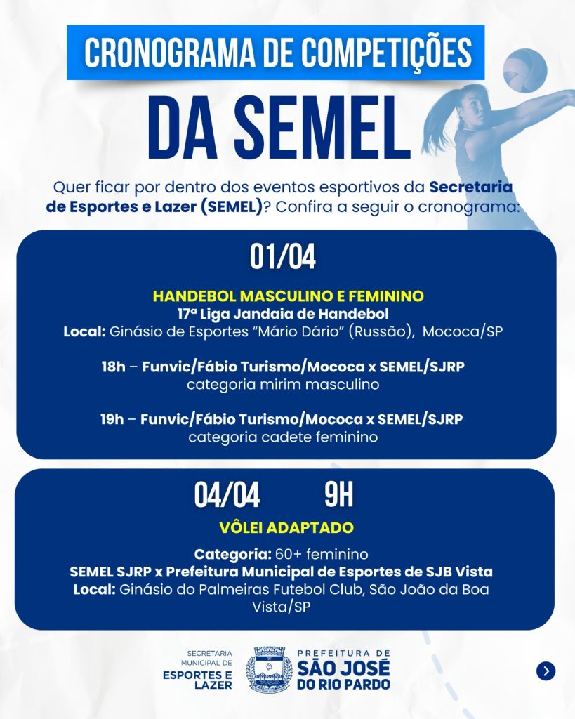 A semana será movimentada para as equipes de São José do Rio Pardo, com jogos dentro e fora do município em diferentes modalidades. Confira a programação: