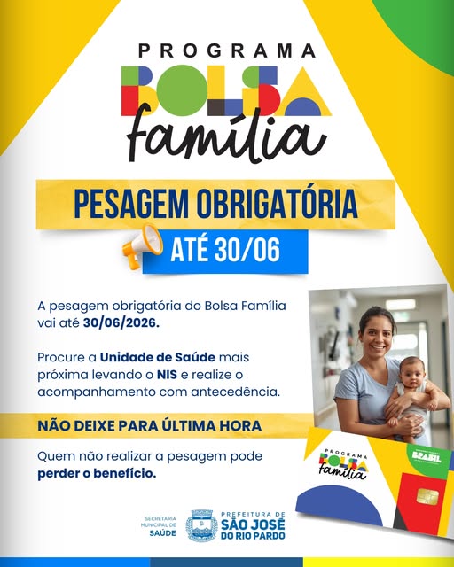 A pesagem obrigatória do 1º semestre de 2026 já está sendo realizada nas Unidades de Saúde e deve ser feita até 30 de junho.