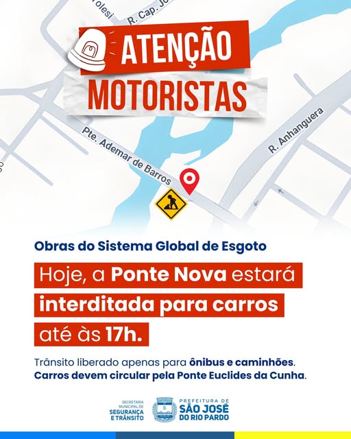 Hoje, a Ponte Nova (Ademar de Barros) estará interditada para a circulação de carros até às 17h, devido a obras no Sistema Global de Esgoto.