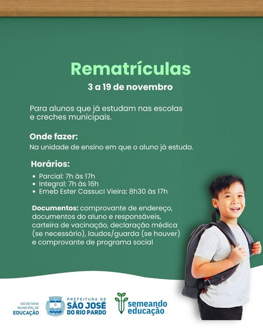 De 03 a 19 de novembro acontecem as rematrículas para alunos que já estudam na Rede Municipal de Ensino.