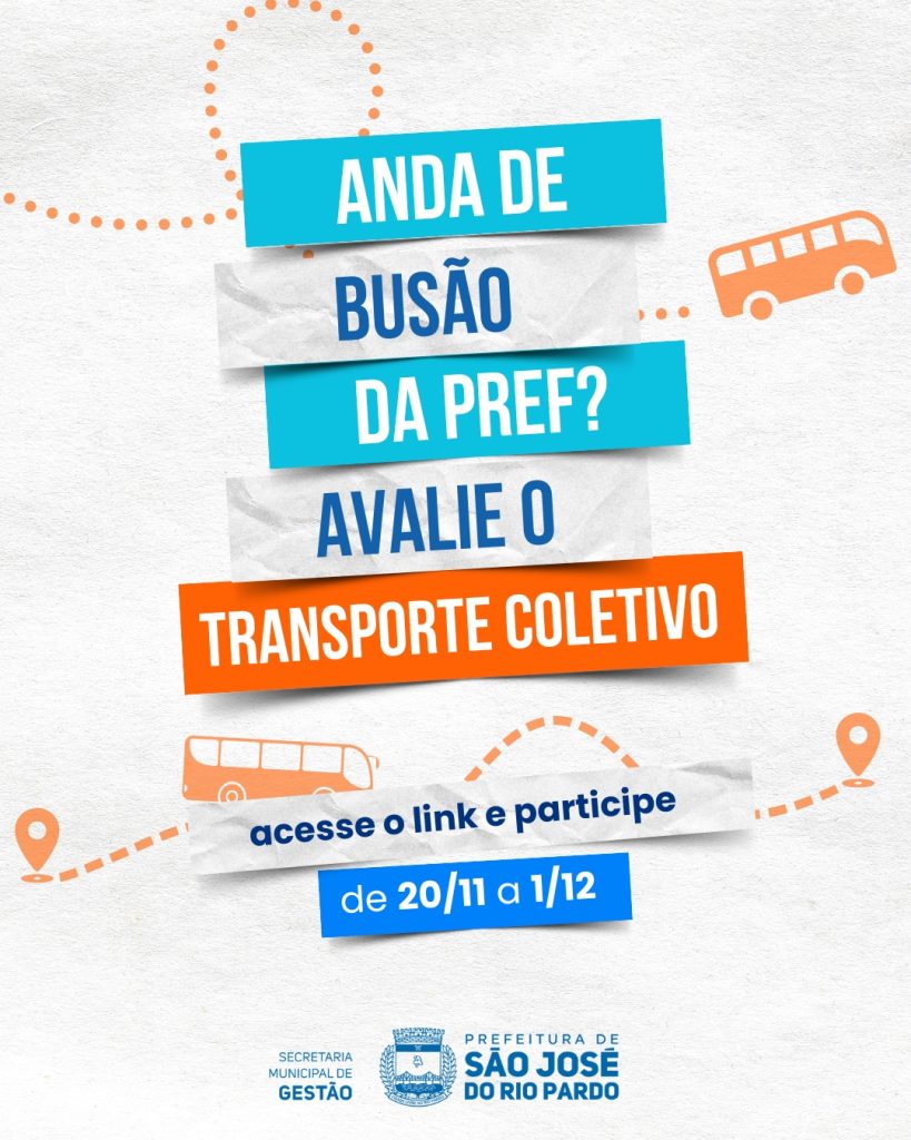 A partir desta quinta-feira (20), a população já pode participar da Avaliação dos Usuários do Transporte Coletivo, uma ação da Prefeitura de São José do Rio Pardo para ouvir quem usa o ônibus no dia a dia e reunir sugestões de melhoria, identificar os principais problemas e os pontos fortes do Transporte.