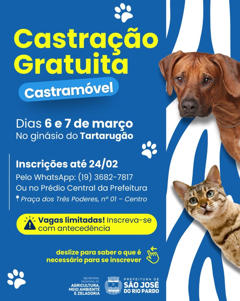 O Castramóvel Pro Pet SP chega ao município para mais uma ação de castração gratuita de cães e gatos, promovendo cuidado, saúde e bem-estar animal.