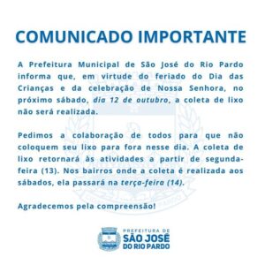 A Prefeitura Municipal informa que, devido ao feriado do Dia