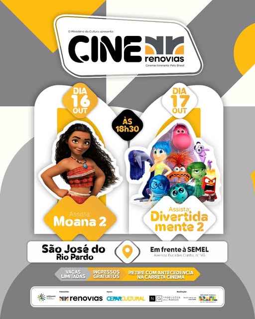 💛 O Cine Renovias é um projeto aprovado pelo Ministério da Cultura e viabilizado pela Lei de Incentivo à Cultura, com patrocínio da Renovias, e executado NG Produções Culturais com apoio da @ceparcultural e da Prefeitura Municipal de São José do Rio Pardo.