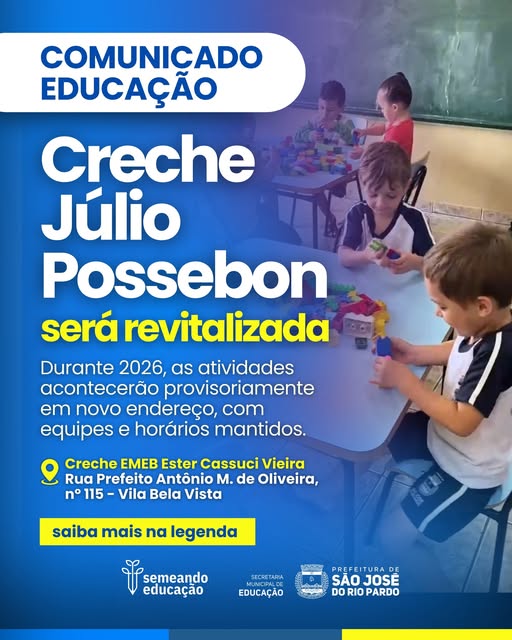 Diante disso, informamos que, no ano letivo de 2026, as atividades da Creche Júlio Possebon serão realizadas provisoriamente no prédio da Creche EMEB Ester Cassuci Vieira, localizado na Rua Prefeito Antônio M. de Oliveira, nº 115, Vila Bela Vista.