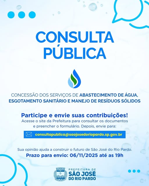 Consulte os documentos, preencha o formulário e envie suas contribuições para: consultapublica@saojosedoriopardo.sp.gov.br