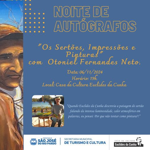 A Prefeitura de São José do Rio Pardo através da Secretaria Municipal de Turismo e Cultura convida toda a população para uma noite imperdível! No dia 6 de novembro às 19 horas, na Casa de Cultura Euclides da Cunha, teremos a honra de receber Otoniel Fernandes Neto para o lançamento de seu livro “Os Sertões: Impressões e Pinturas”.
