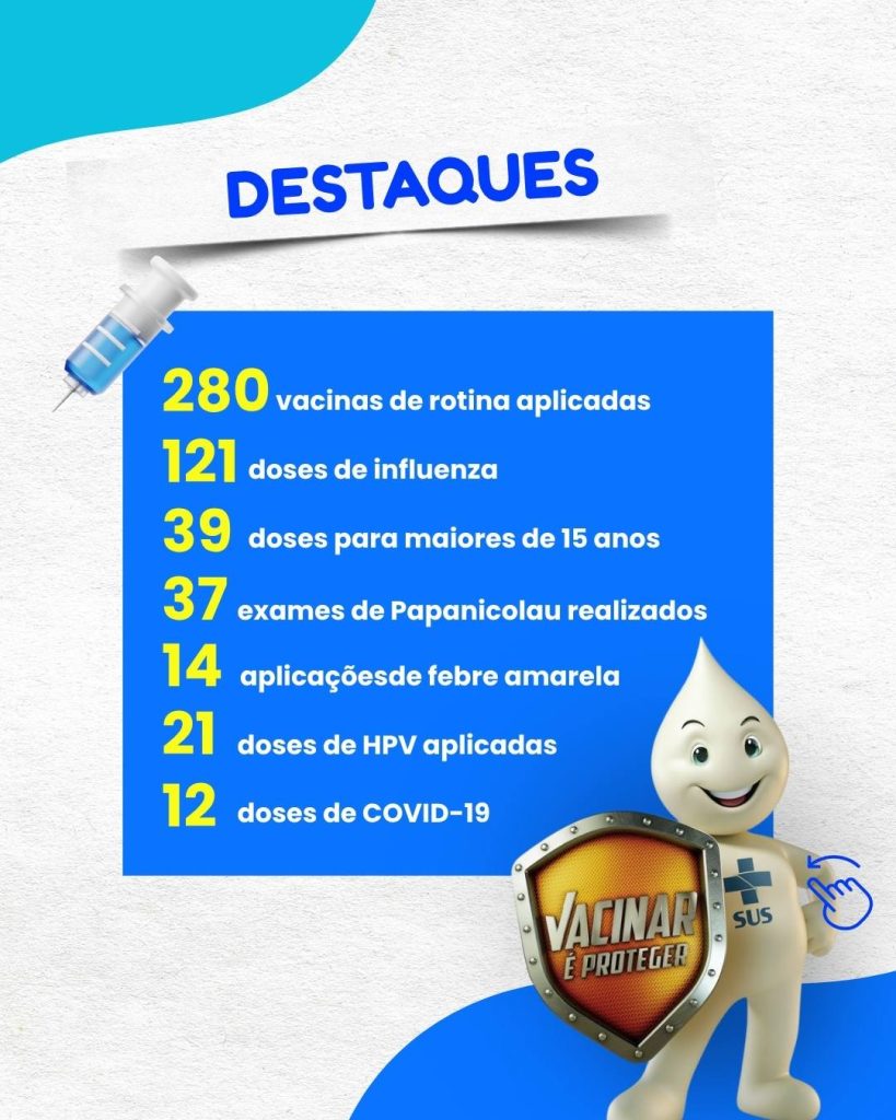 👉 No carrossel, você confere o balanço das doses aplicadas — vacinas de rotina, HPV, influenza, COVID-19 e febre amarela — além da realização de exames de Papanicolau para as mulheres. 💙