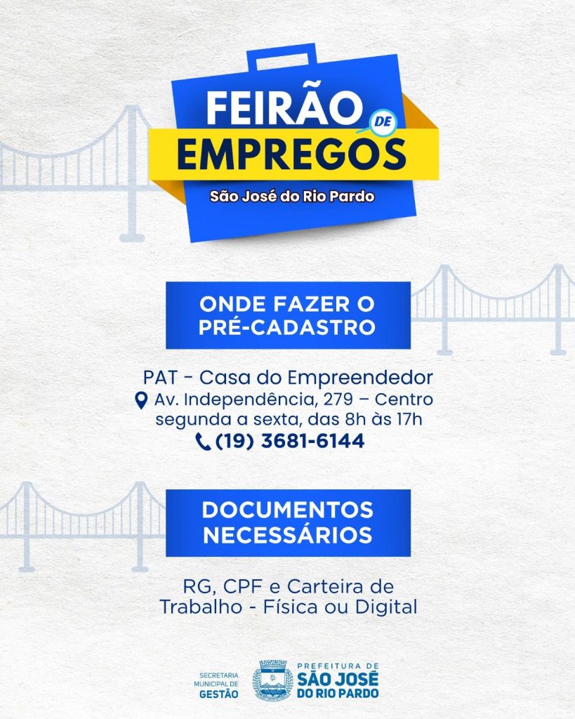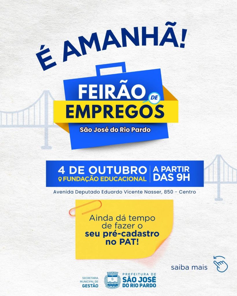 O 1º Feirão de Empregos de São José do Rio Pardo acontece neste sábado, 04/10, a partir das 9h, na Fundação Educacional.