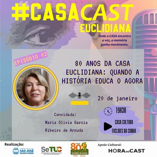 A Prefeitura Municipal de São José do Rio Pardo, por meio da Secretaria Municipal de Turismo e Cultura e da Casa de Cultura Euclides da Cunha, com apoio cultural da Hora do Cast abre oficialmente o ano comemorativo dos 80 anos da Casa Euclidiana (1946–2026) com um episódio especial do Podcast da Casa Euclidiana, que também integra as celebrações pelos 160 anos de nascimento de Euclides da Cunha.