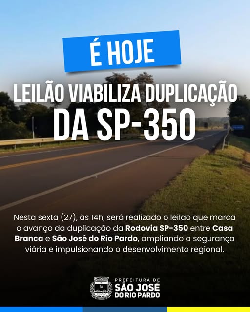 Nesta sexta-feira (27), às 14h, será realizado na B3 — a Bolsa de Valores do Brasil, em São Paulo, o leilão do Lote Rota Mogiana, que prevê a duplicação da Rodovia SP-350 no trecho entre Casa Branca e São José do Rio Pardo.