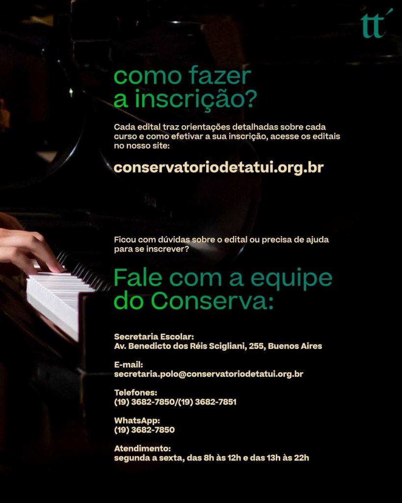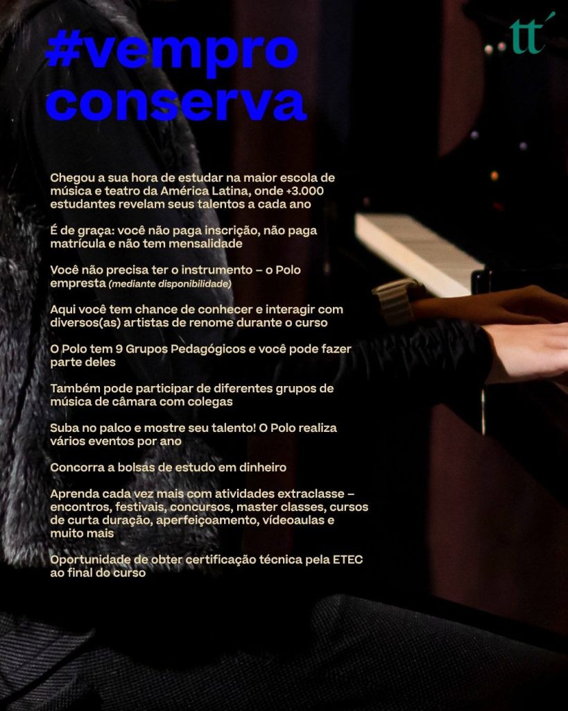 📄 Para saber todos os detalhes sobre cursos, vagas e critérios de seleção, acesse o link na BIO do Conservatório de Tatuí (linktr.ee/conservatoriotatui)