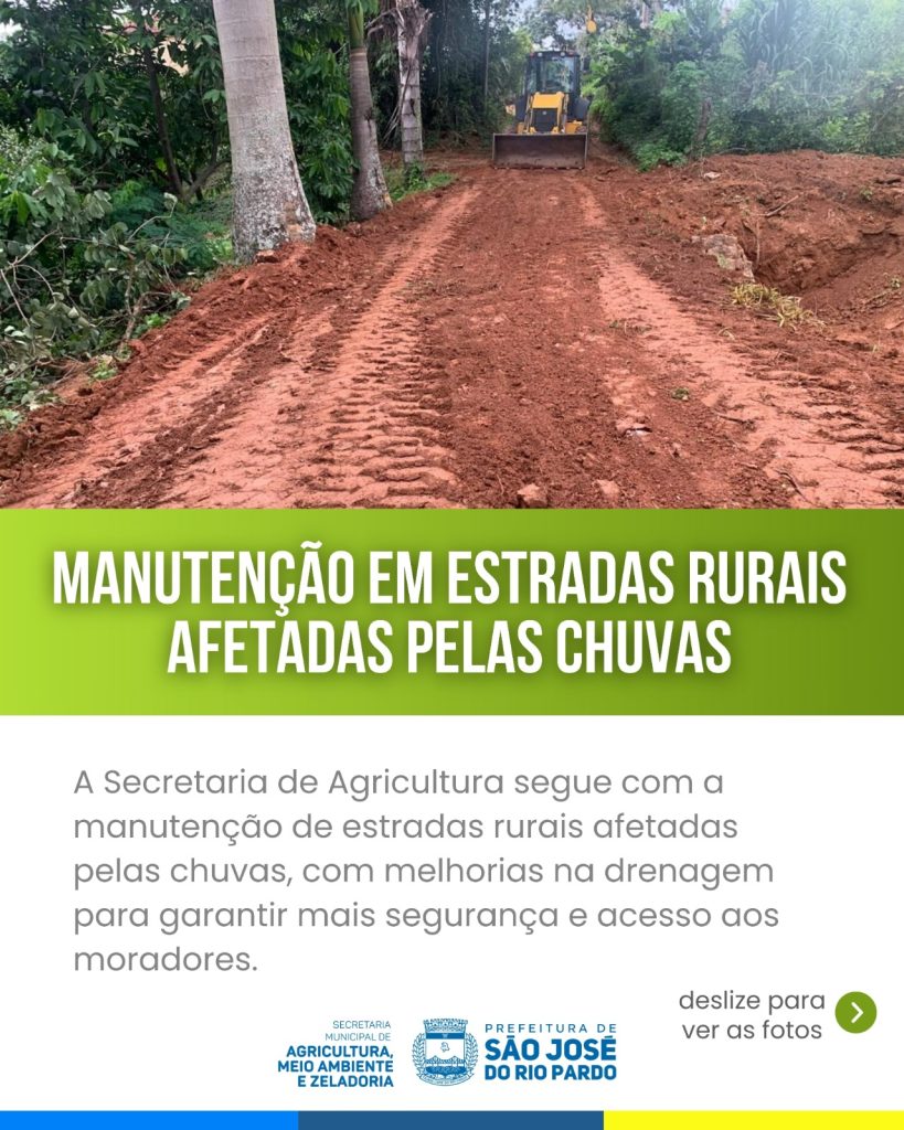 A Secretaria de Agricultura segue trabalhando na recuperação de trechos de estradas rurais impactados pelas fortes chuvas recentes.