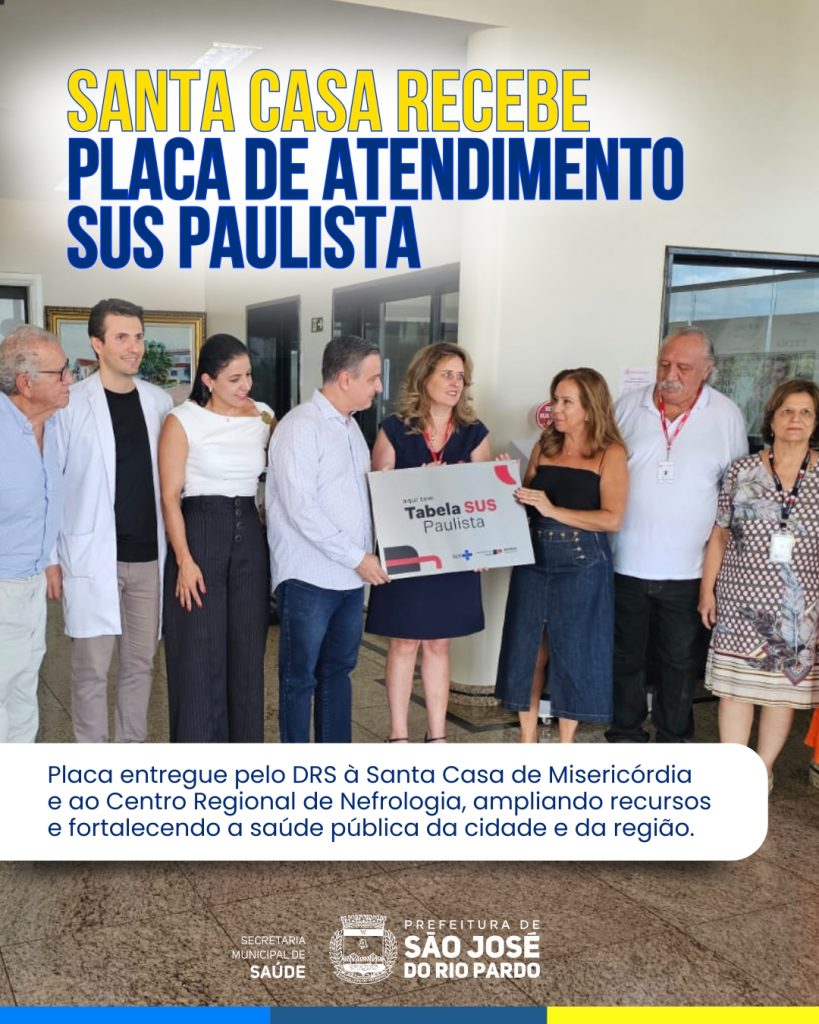 Na última quinta-feira (15), a Santa Casa de Misericórdia e o Centro Regional de Nefrologia receberam a Placa de Atendimento SUS Paulista, entregue pelo DRS (Departamento Regional de Saúde).