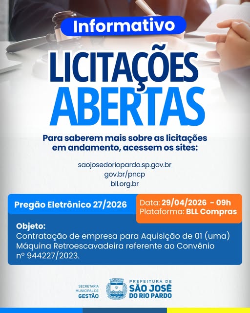 A Prefeitura de São José do Rio Pardo divulga nova licitação aberta nesta semana para aquisição de retroescavadeira, visando fortalecer os serviços do município.
