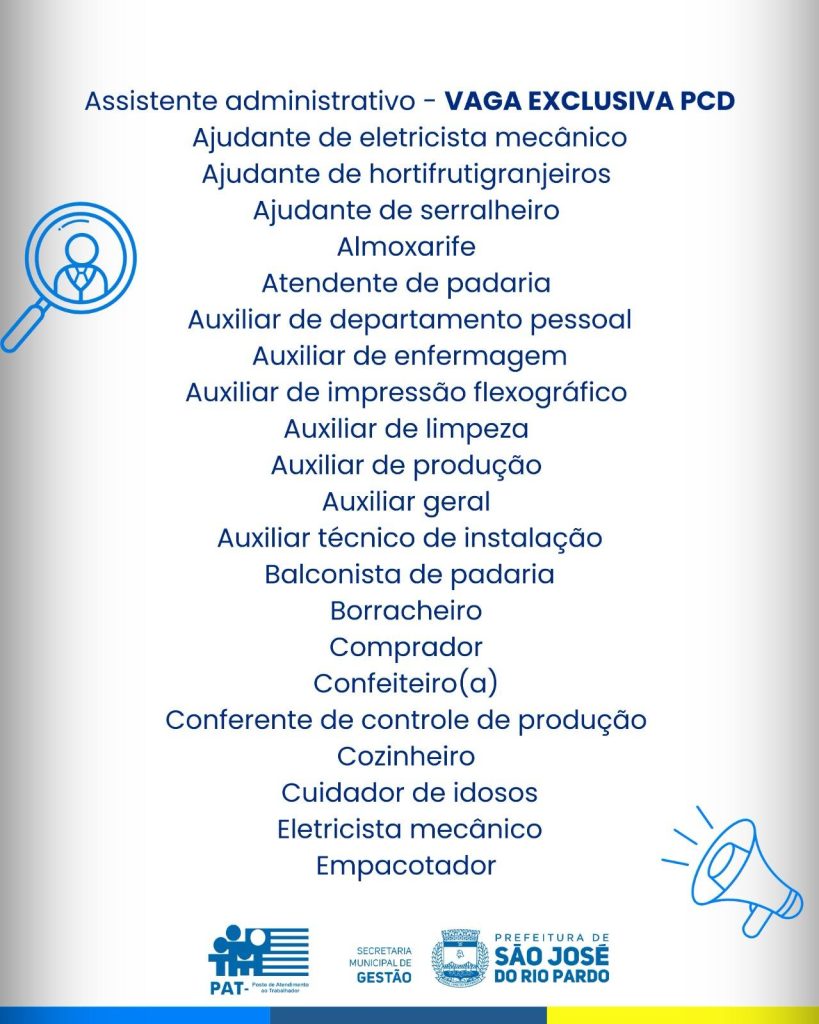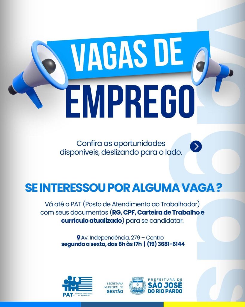 O PAT de São José do Rio Pardo divulgou novas oportunidades para quem está em busca de trabalho. Há vagas em diversas áreas e para diferentes perfis profissionais.