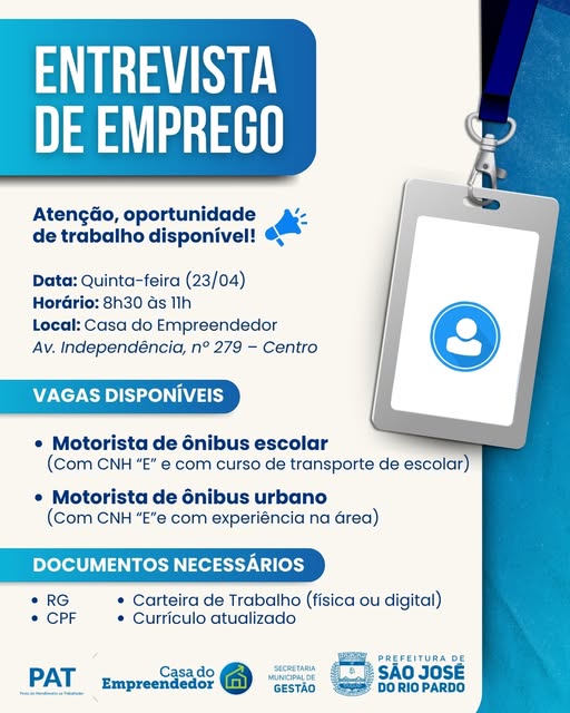 O PAT (Posto de Atendimento ao Trabalhador) realizará, nesta quinta-feira (23/04), das 8h30 às 11h, entrevistas de emprego para novas oportunidades.