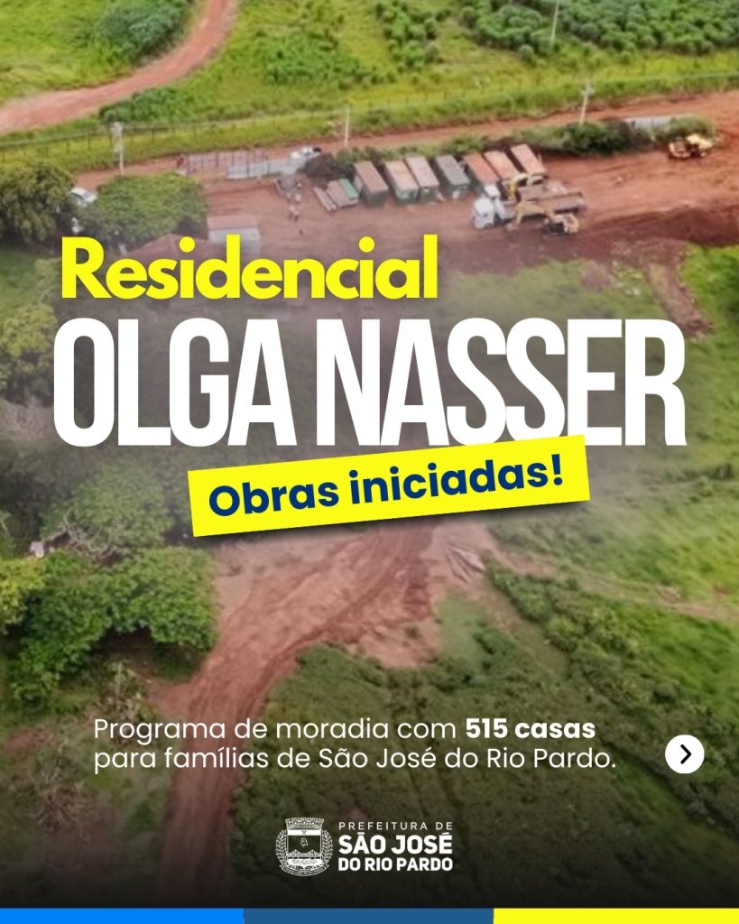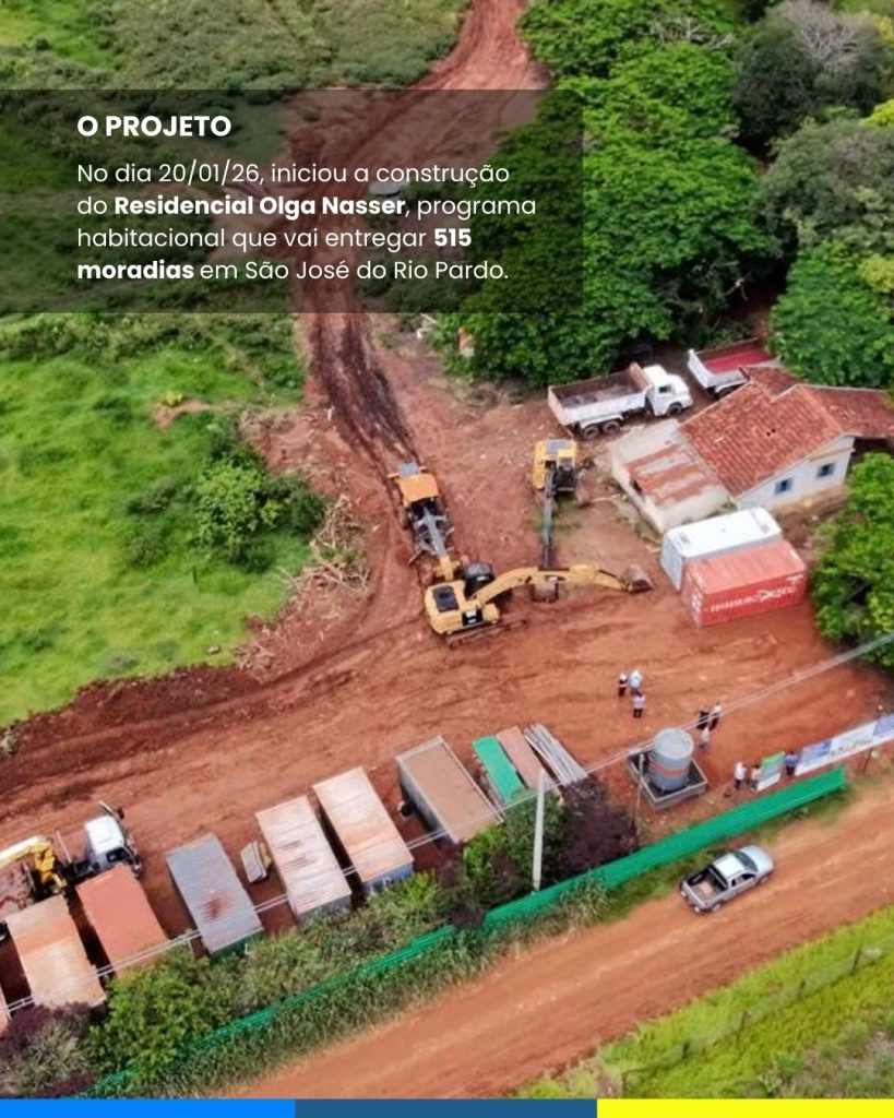 Teve início a construção do Residencial Olga Nasser, programa habitacional que vai entregar 515 moradias em São José do Rio Pardo. O projeto representa um novo bairro em formação, com infraestrutura completa e localização estratégica, na entrada da cidade, ao lado do bairro Domingos de Sillus.