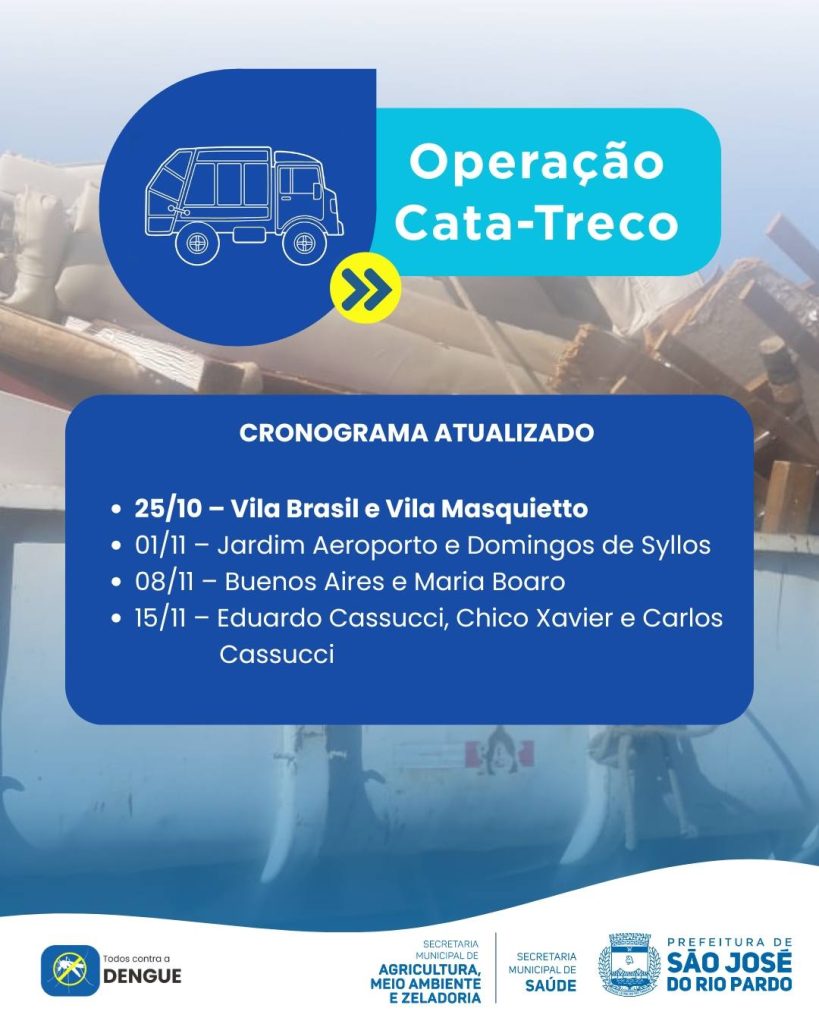 No dia 25 de outubro, o caminhão da Operação Cata-Treco passará pelos bairros Vila Brasil e Vila Masquietto, das 7h às 12h.