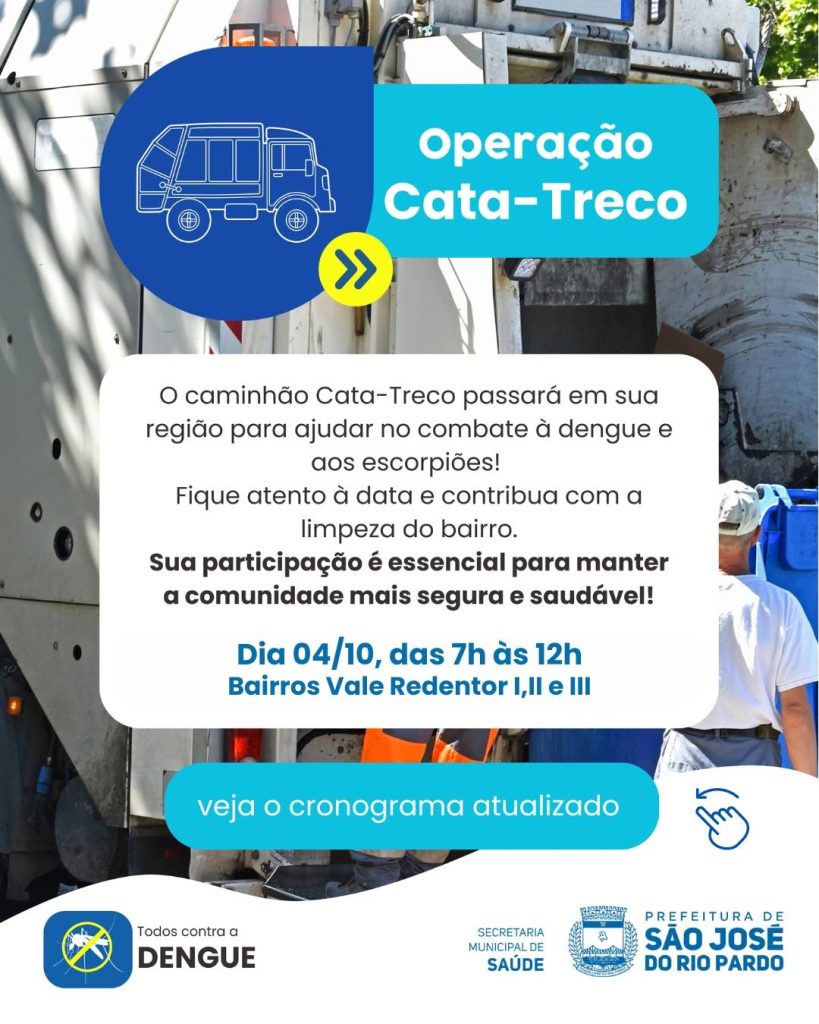 O caminhão Cata-Treco passará recolhendo os objetos que não têm mais utilidade, ajudando no combate à dengue e aos escorpiões. 🦟🦂