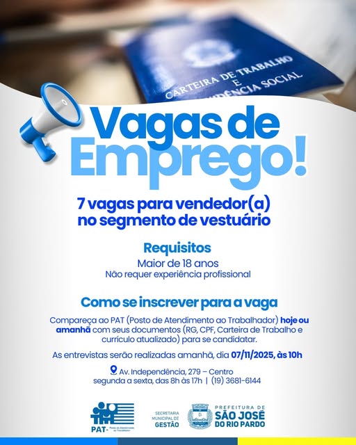 📄 Compareça hoje ou amanhã ao PAT (Posto de Atendimento ao Trabalhador) com seus documentos: RG, CPF, Carteira de Trabalho e currículo atualizado.