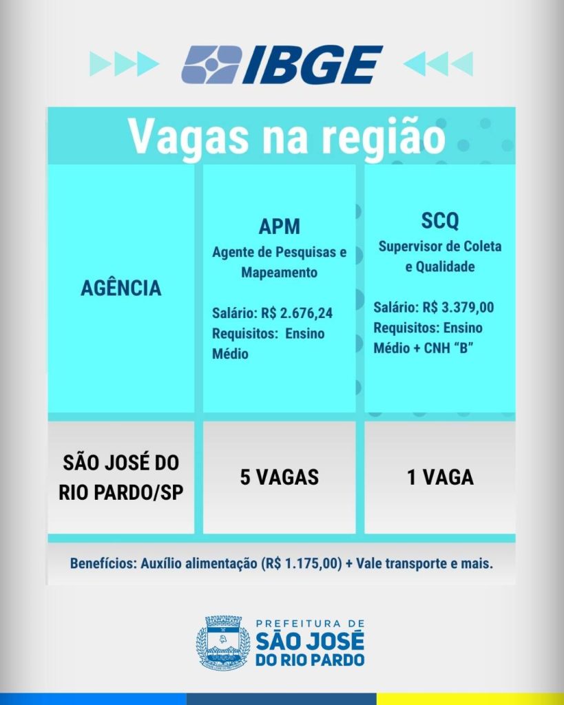 O IBGE está com 6 vagas temporárias abertas em São José do Rio Pardo.