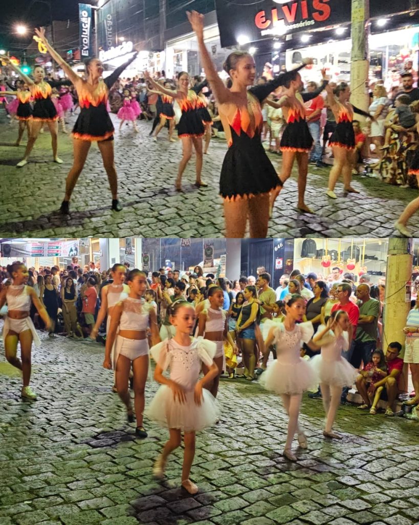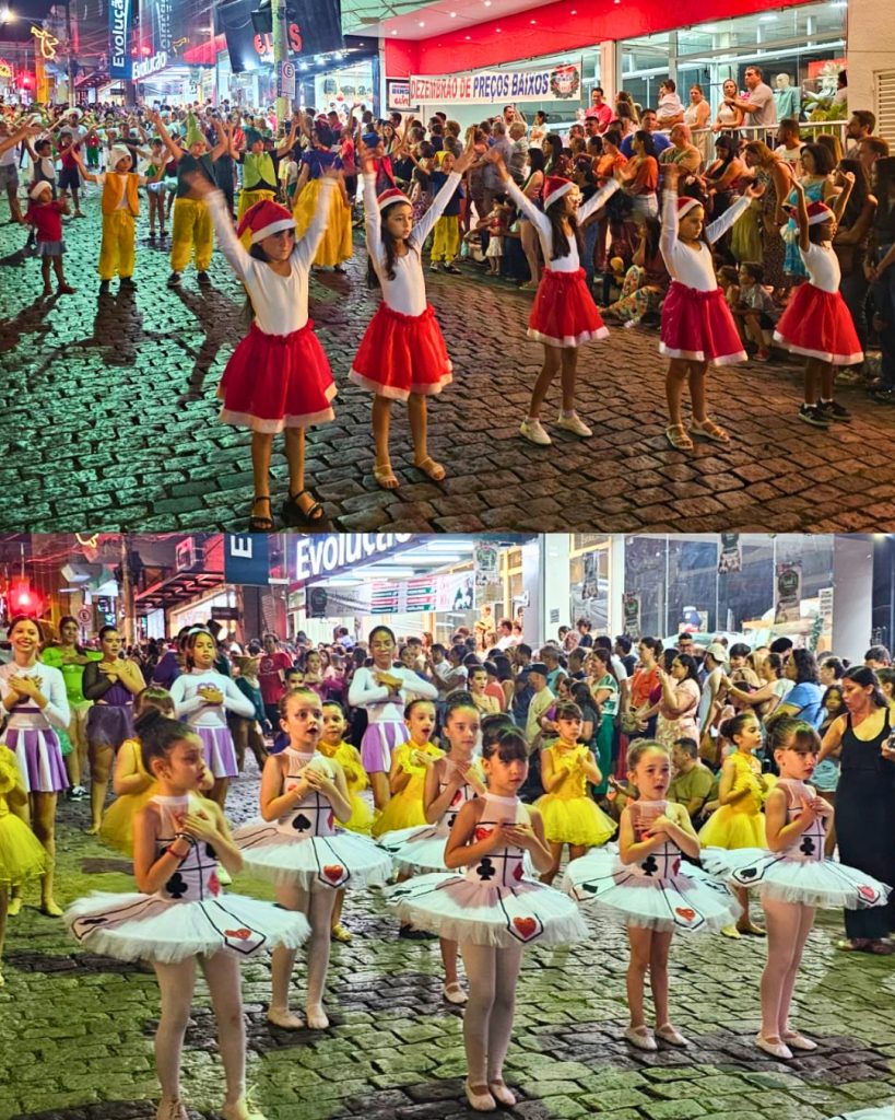 O desfile também foi um grande espetáculo coletivo. Mais de 20 entidades participaram, entre elas escolas, empresas, grupos artísticos da programação de Natal e da Fábrica de Expressão, academias, escolas de idiomas e instituições sociais. Além disso, a Corporação Musical e o tradicional trenó do Papai Noel deram ainda mais vida ao cortejo.
