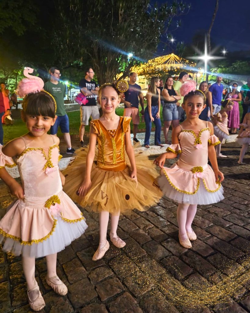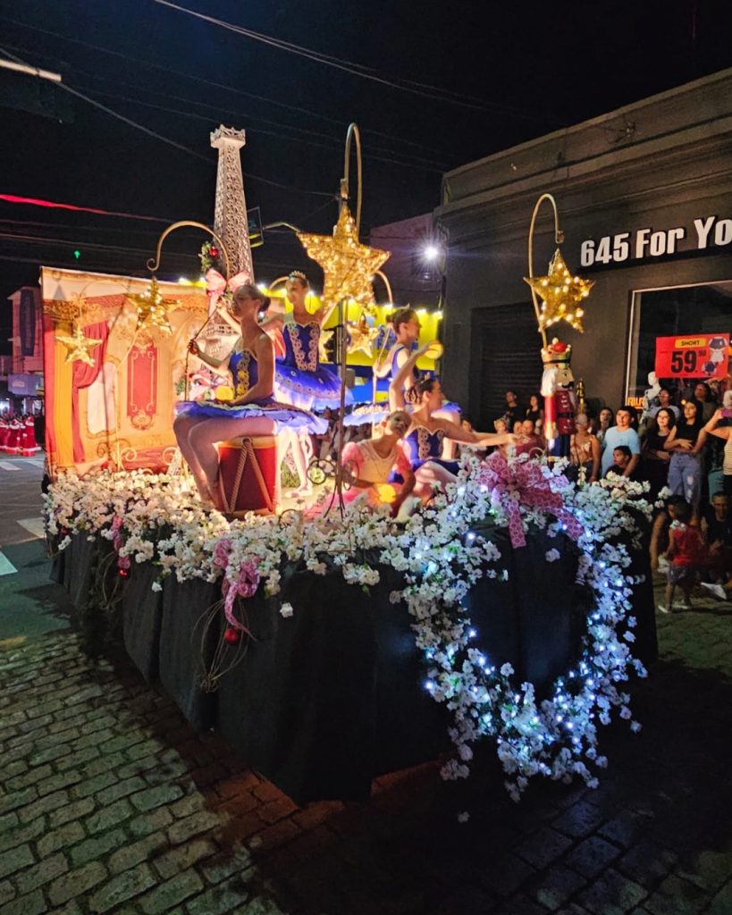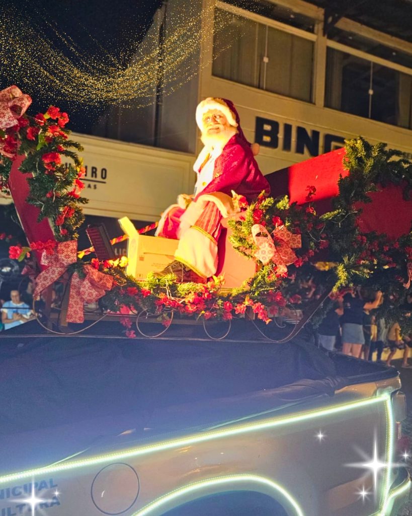 O cortejo percorreu a Rua Francisquinho Dias até a Escadaria da Igreja Matriz. Ali, a contagem regressiva marcou o acendimento das luzes da Praça, transformando o local em um cenário iluminado e festivo. A chegada do Papai Noel coroou o momento e encantou as famílias.