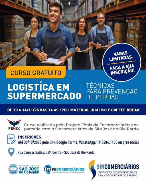 ✅ O Projeto Fênix, da Fecomerciários, presidida por Luiz Carlos Motta, em parceria com o Sindicato dos Comerciários e apoio da Prefeitura Municipal de São José do Rio Pardo está oferecendo mais uma grande oportunidade de aprimoramento profissional: o curso gratuito Logística em Supermercado – Técnicas para Prevenção de Perdas.
