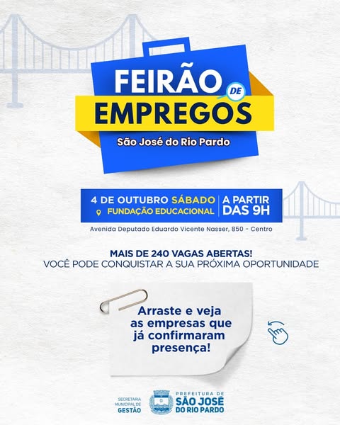 No dia 04 de outubro, a partir das 9h, acontece o 1º Feirão de Empregos de São José do Rio Pardo, na Fundação Educacional.