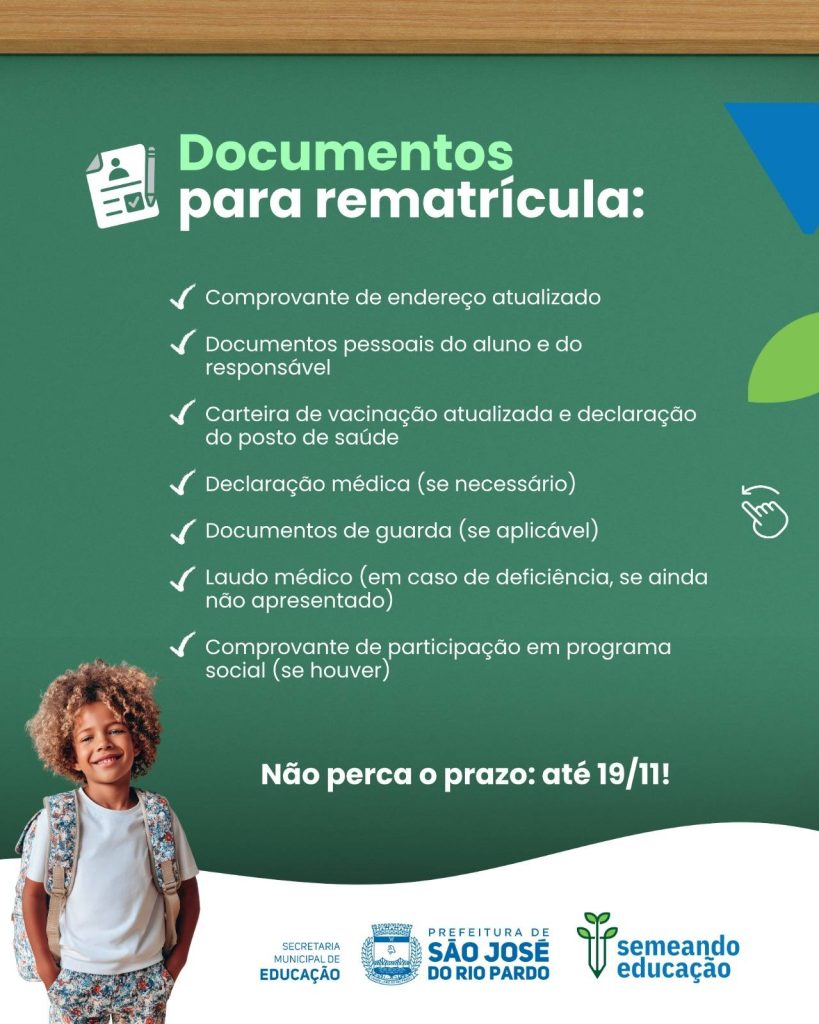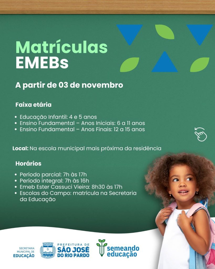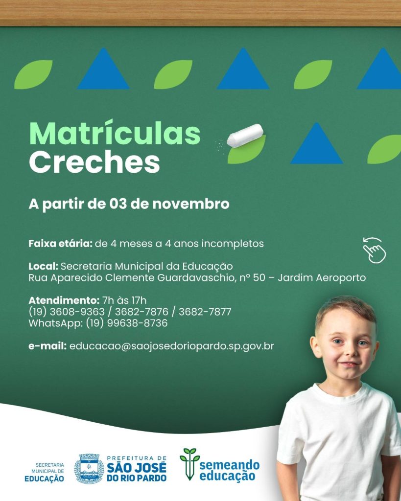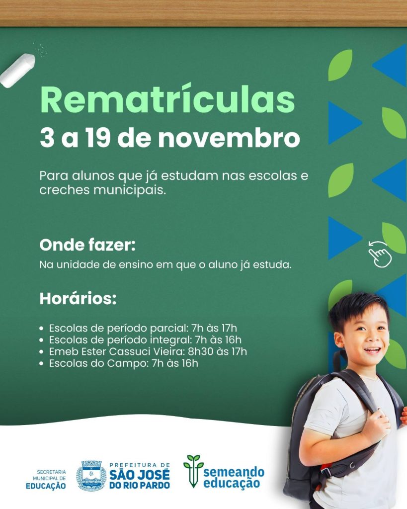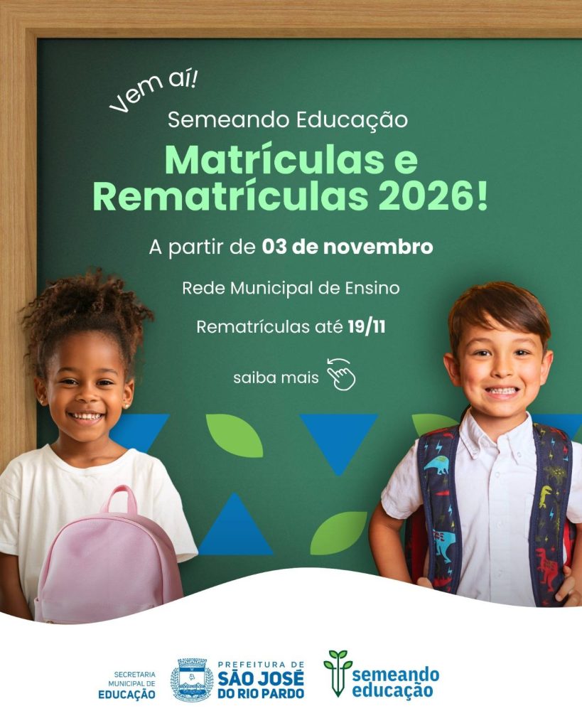 A partir de hoje, 03 de novembro, começam as matrículas e rematrículas para o ano letivo de 2026 na Rede Municipal de Ensino de São José do Rio Pardo.