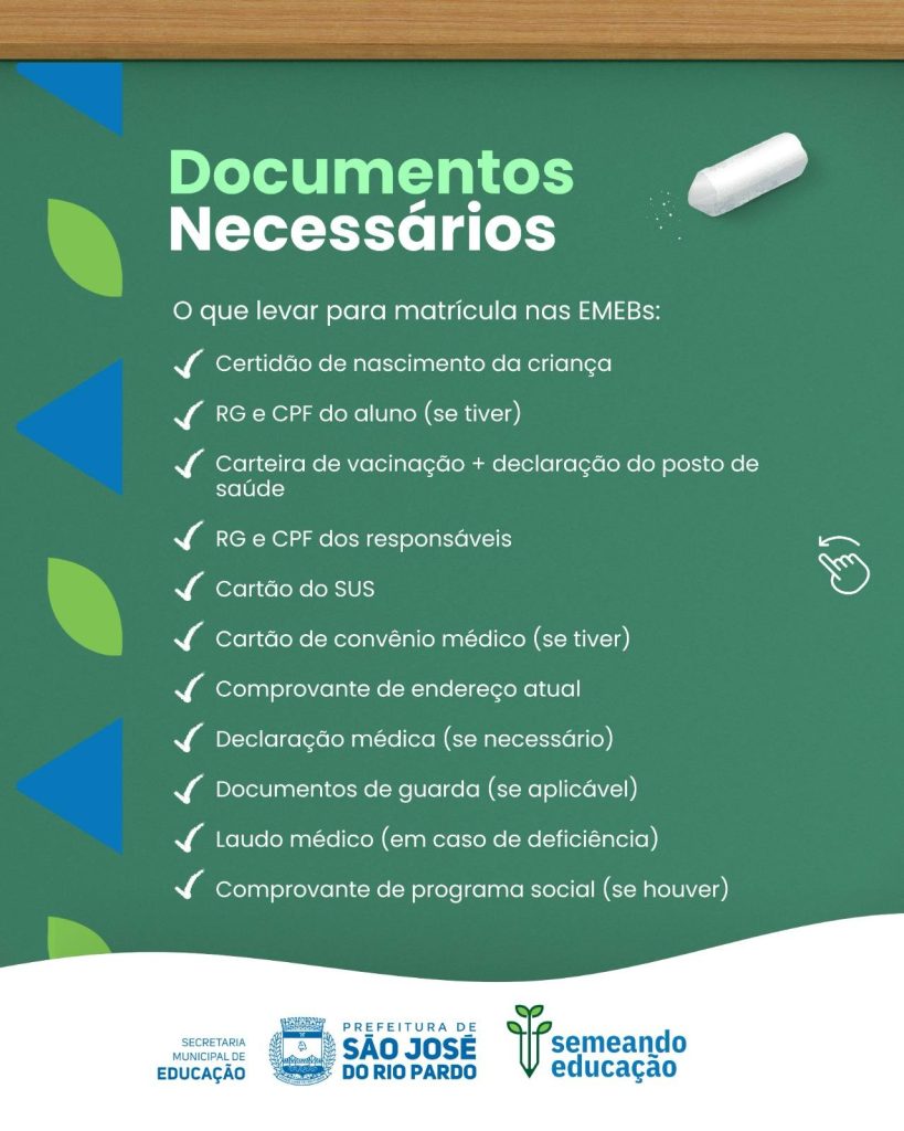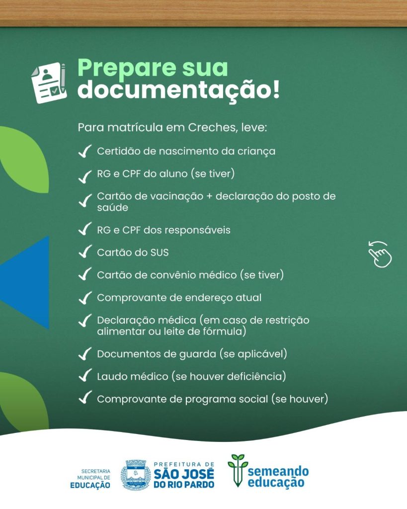 👉 Confira no carrossel todas as informações sobre prazos, locais de atendimento e documentos necessários para creches e EMEBs.