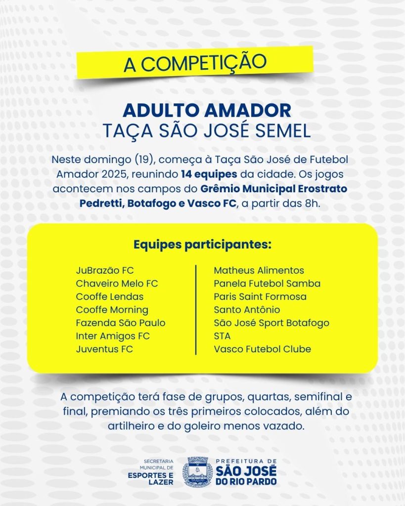 A Prefeitura de São José do Rio Pardo, por meio da SEMEL, dá início no último domingo (19) à Taça São José de Futebol Amador 2025, reunindo 14 equipes da cidade.