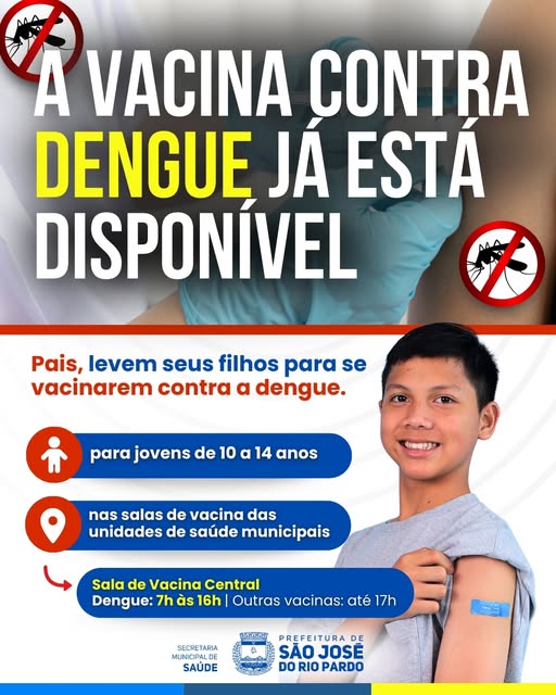 A vacinação contra a dengue já está disponível em todas as salas de vacina dos bairros, para crianças e adolescentes de 10 a 14 anos.