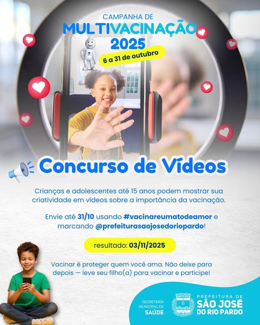 A Campanha de Multivacinação segue até 31 de outubro, e para incentivar a conscientização, está acontecendo o Concurso de Vídeos “Vacinar é um ato de amor”, voltado para crianças e adolescentes de até 15 anos.