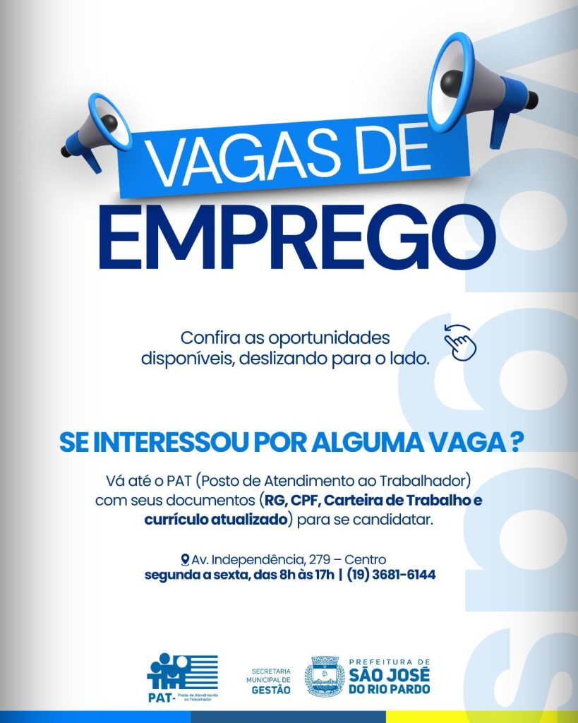 O PAT de São José do Rio Pardo está com novas oportunidades para quem busca entrar ou se recolocar no mercado de trabalho. São vagas para diferentes áreas e níveis de experiência!