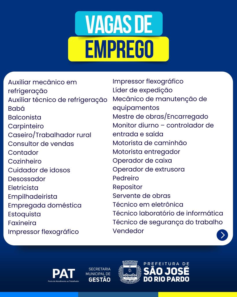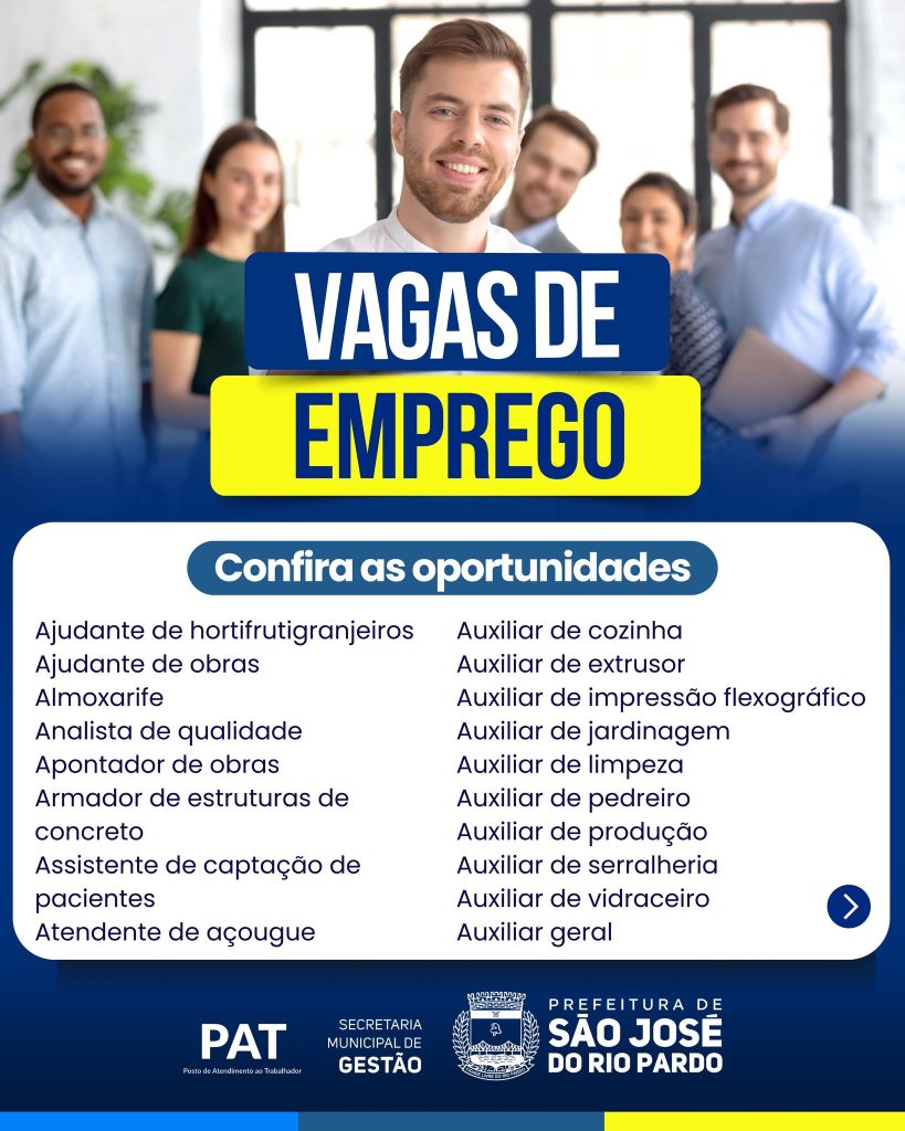 O PAT de São José do Rio Pardo está com novas oportunidades em diversas áreas.