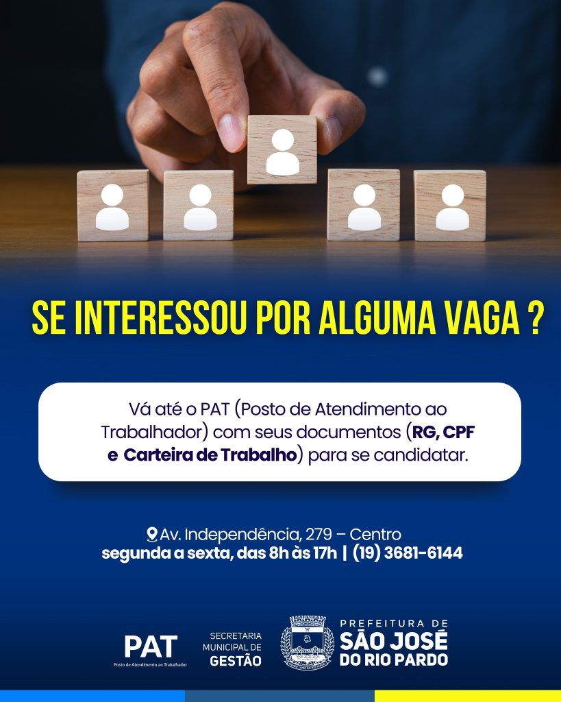 O Posto de Atendimento ao Trabalhador (PAT) de São José do Rio Pardo está com novas oportunidades de emprego em diversas áreas.