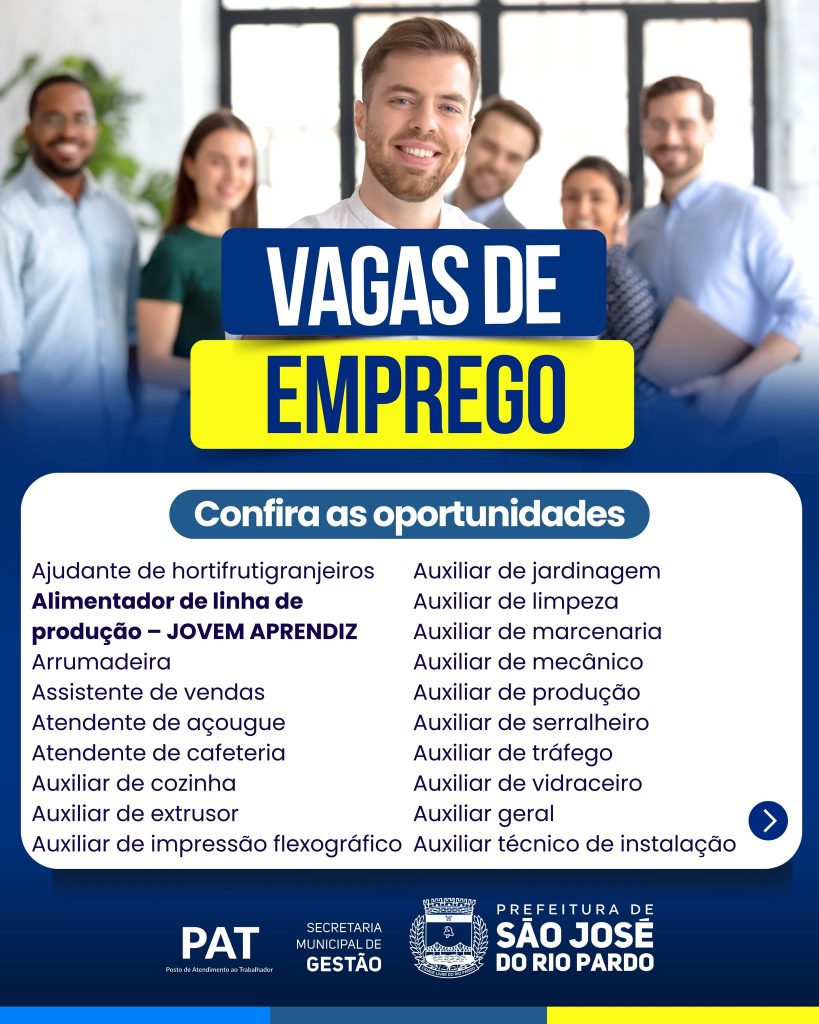 O Posto de Atendimento ao Trabalhador (PAT) de São José do Rio Pardo está com novas oportunidades de emprego em diversas áreas.